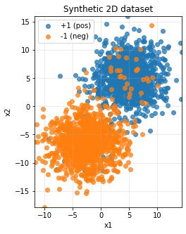 n_per_class=1000creates 1,000 points for each class (2,000 total points)mean=5centers the positive class around (5, 5) and negative class around (-5, -5), making them well-separated initiallystd=3.2controls how spread out the points are—larger values mean more scattered dataangle_deg=25.0rotates the negative class by 25 degrees, creating intentional overlap between classes to make the problem more challengingflip_prob=0.03randomly flips 3% of the labels to introduce noise, simulating real-world messy data