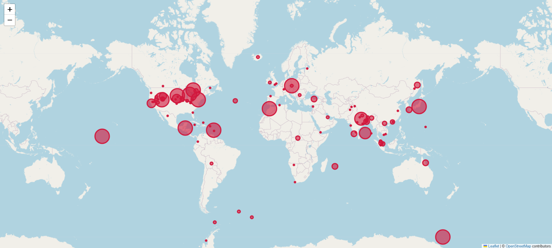 - With coordinates, place names, and frequencies, we can plot them on a map. They use Leaflet, a mobile-friendly open-source JavaScript library.
