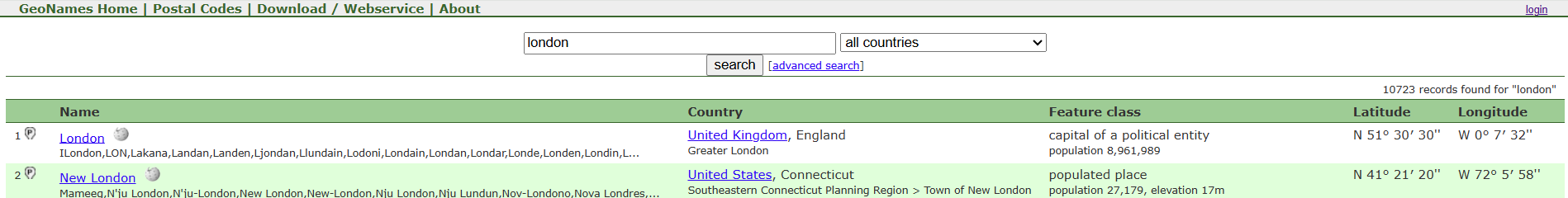 - Disambiguation for identical place names is weak.